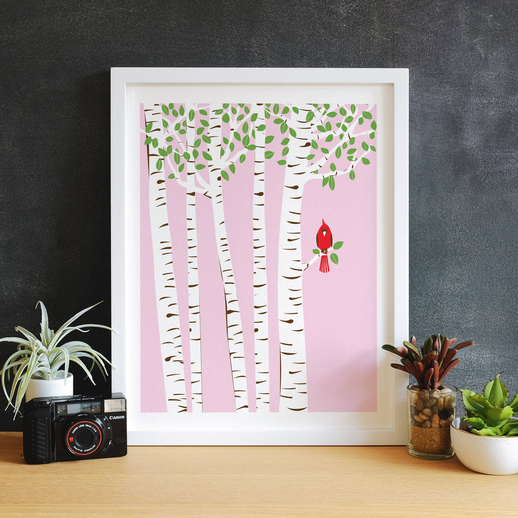Small Summer Cardinal Print Birch Tree Art Red Bird Art